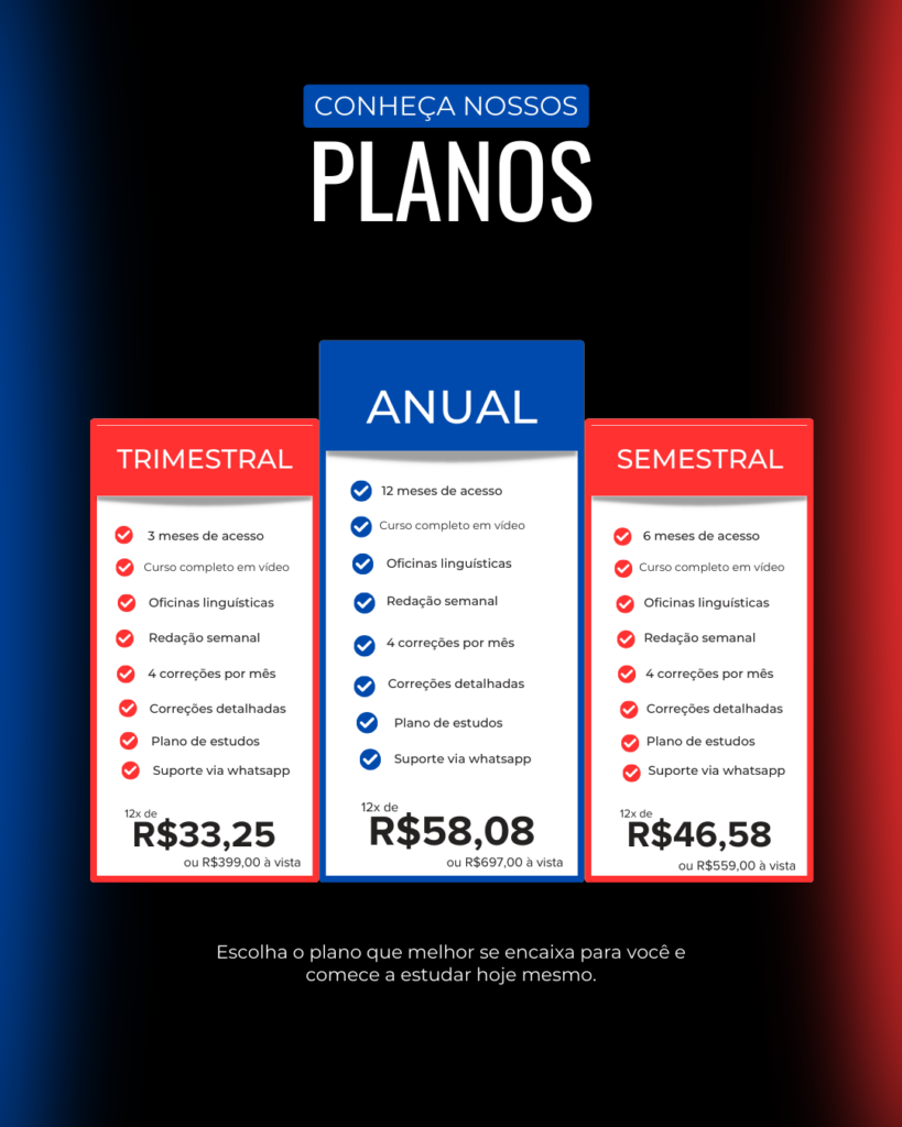 Explore nossos planos acessíveis para impulsionar sua escrita e garantir uma nota acima de 900 no Enem.