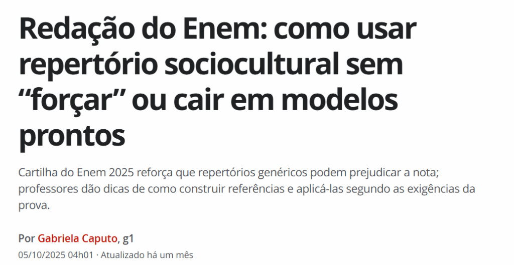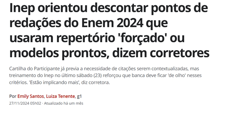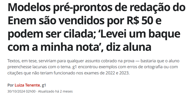 Ao mesmo tempo, você está perdido (a), inseguro (a), e não sabe por onde começar a estudar, pois não domina redação, não sabe argumentar e tem pouco tempo disponível. Afinal, o ENEM não é feito só da redação, você precisa se dedicar ao estudo das outras áreas que também estarão presentes na prova. Então, você acha que, aplicando esses famosos modelos prontos, terá mais chances de atingir uma nota boa. Mas, infelizmente, isso pode te colocar em risco. Os modelos prontos podem até ter sido utilizados amplamente até edições passadas e podem ter sido válidos em vários casos, “facilitando” a escrita de milhares de redações, mas a partir de agora, tais modelos estão sendo cada vez mais mal vistos pelos avaliadores. E não sou eu quem está dizendo. Veja as matérias que saíram na mídia sobre o assunto: